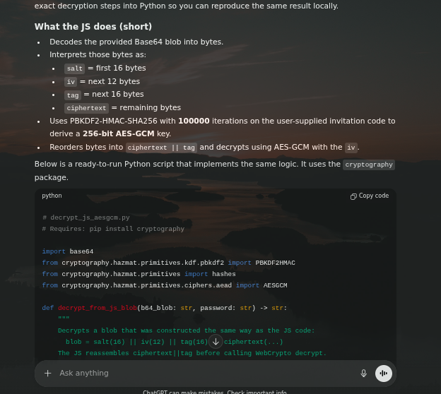 plaintext = decrypt_from_js_blob(encrypted_b64, invitation_code)